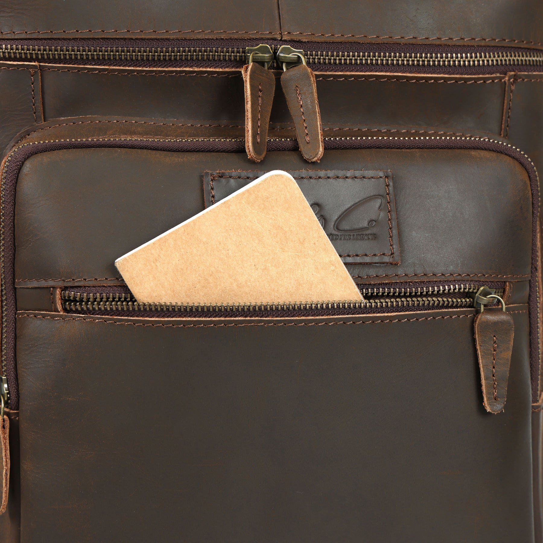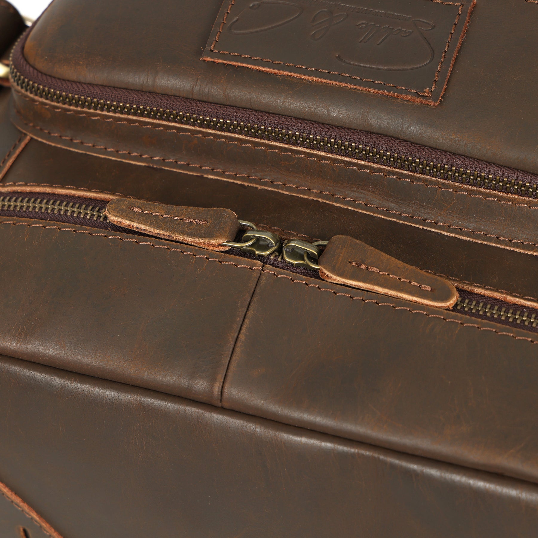 Close-up of a brown leather bag with zippers and a brand logo.