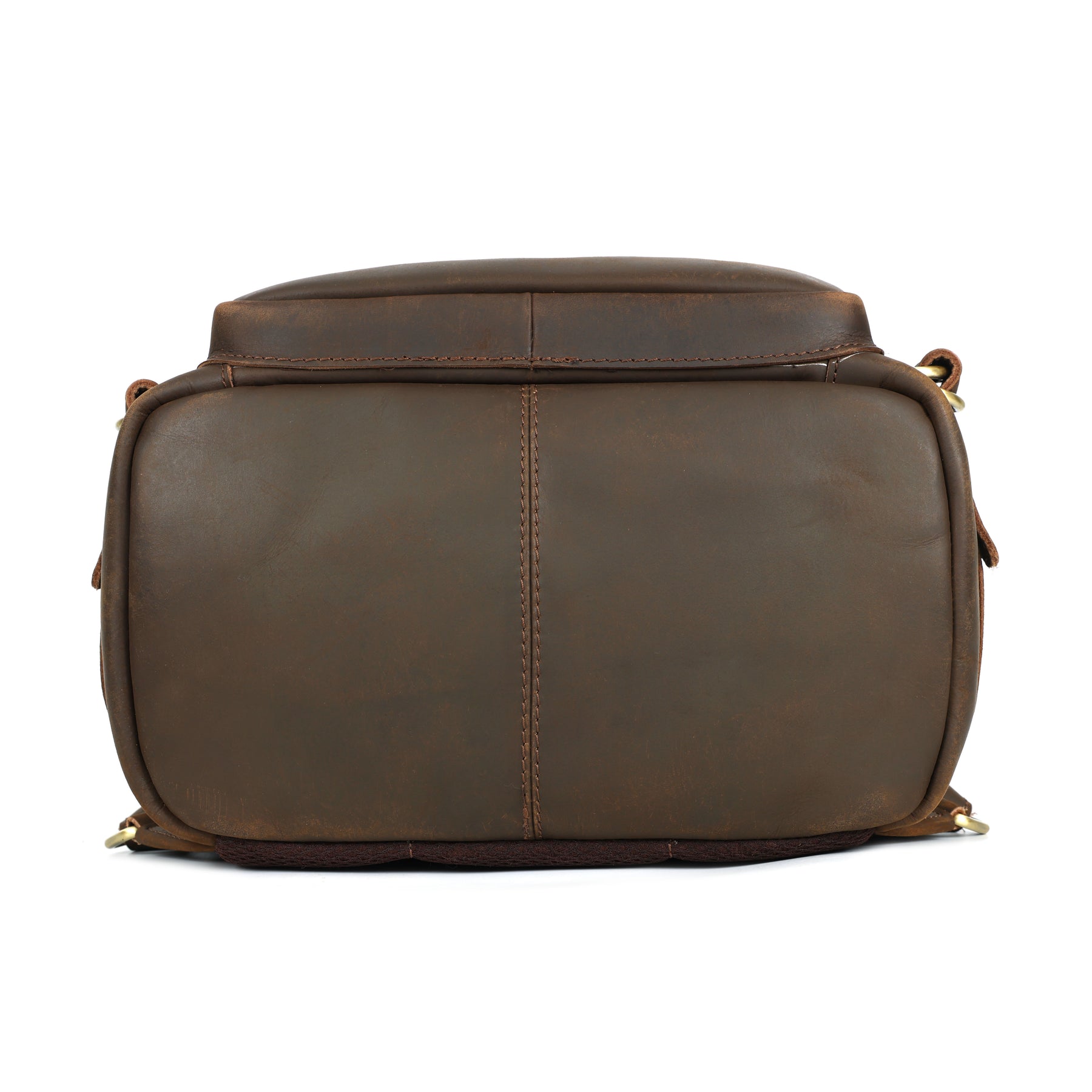 Brown leather backpack with visible stitching on a white background